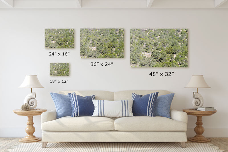 1.25" deep wrapped canvas. solid front construction. Canvas won't stretch or sag. Beautiful corners, finished backing & ready to hang.